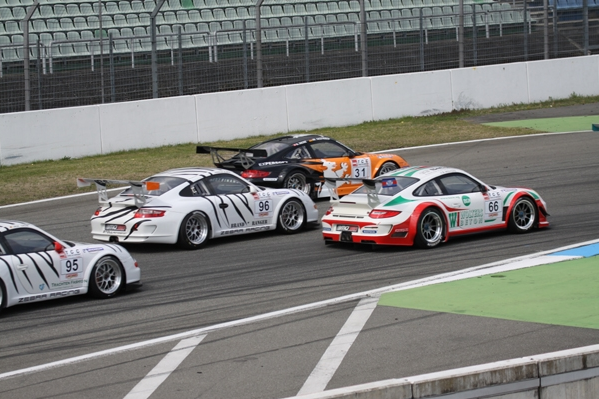 Am Renntag herrschte mal wieder wechselhaftes Wetter mit Schauern. Doch in beiden Rennen war es soweit abgetrocknet, daß Slickreifen aufgezogen wurden. Im ersten Rennen konnte HB trotz stark abbauenden Reifen und einem fairen, spannenden Kampf mit Jürgen Bender, einen soliden 5. Gesamtplatz herausfahren. Kurz vor Schluss überholte er noch die beiden Corvettes von Klüber und Beisel und konnte somit sogar den 2. Platz in der Klasse verbuchen.